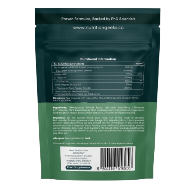 Ashwagandha KSM-66 Extract (Withania somnifera), L-Tryptophan, Capsule Shell (Hydroxypropyl Methylcellulose), Black Pepper Extract (Piper nigrum L.), Anti-Caking Agent (Magnesium Stearate), Vitamin B6 (Pyridoxine HCl).